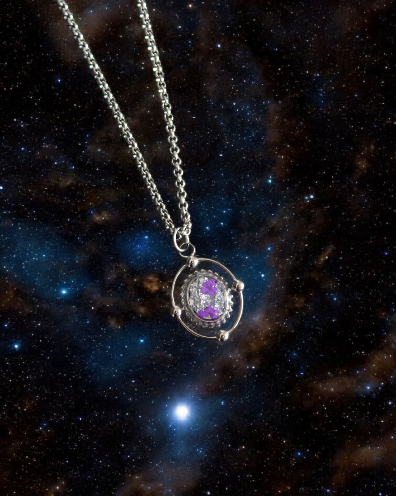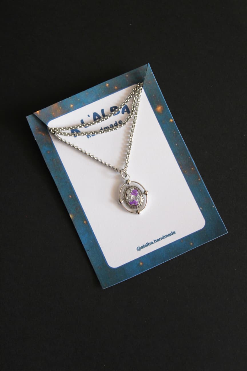 Colgante hecho a mano con pan de plata y flores de zanahoria morada.