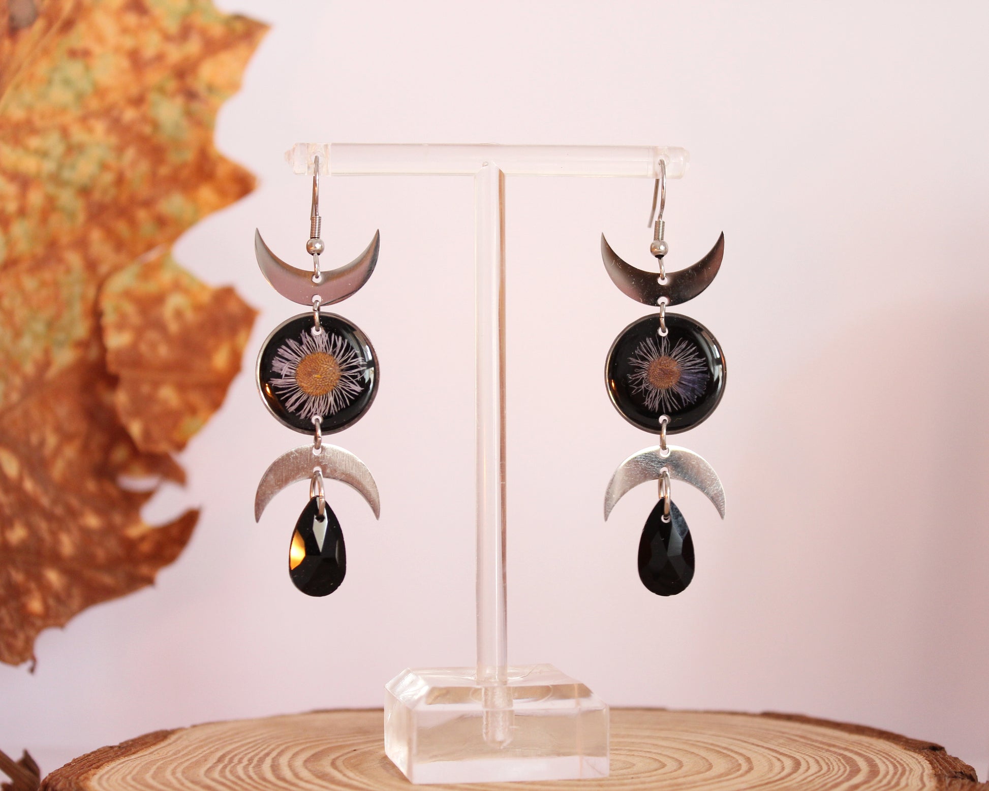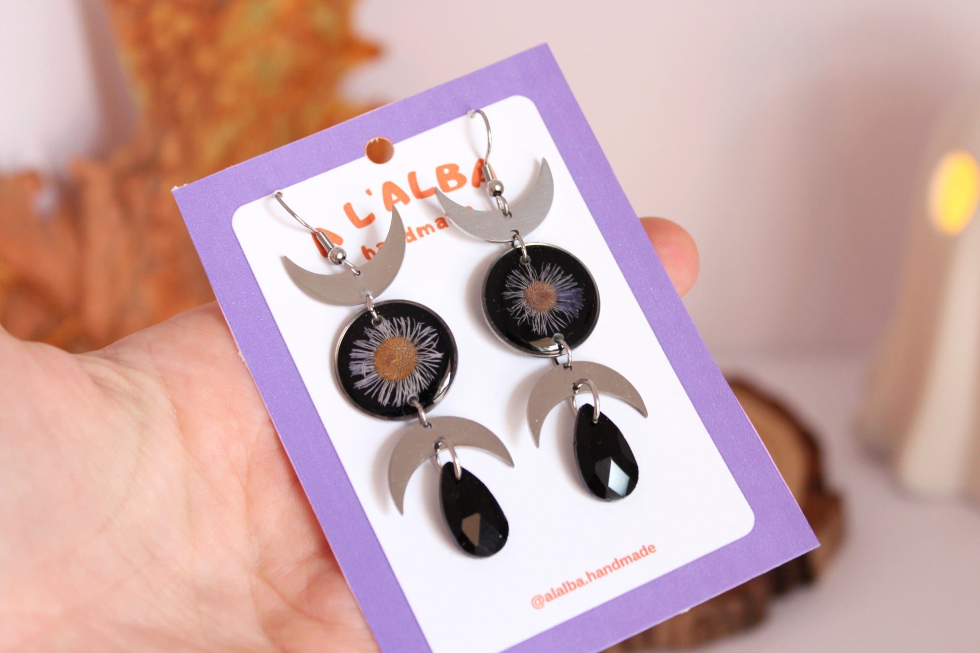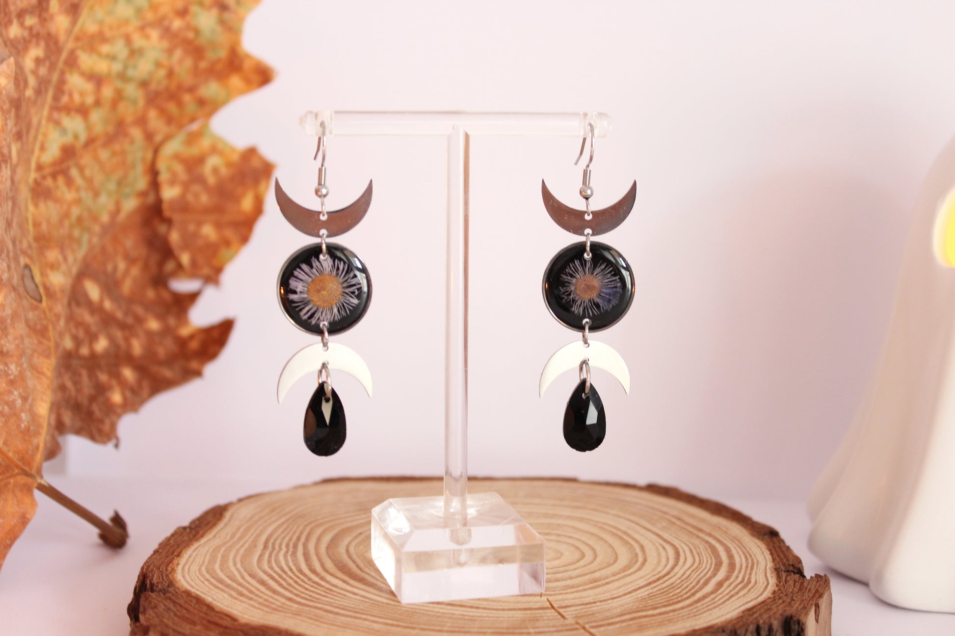 Pendientes triple diosa con margaritas encapsuladas en resina.