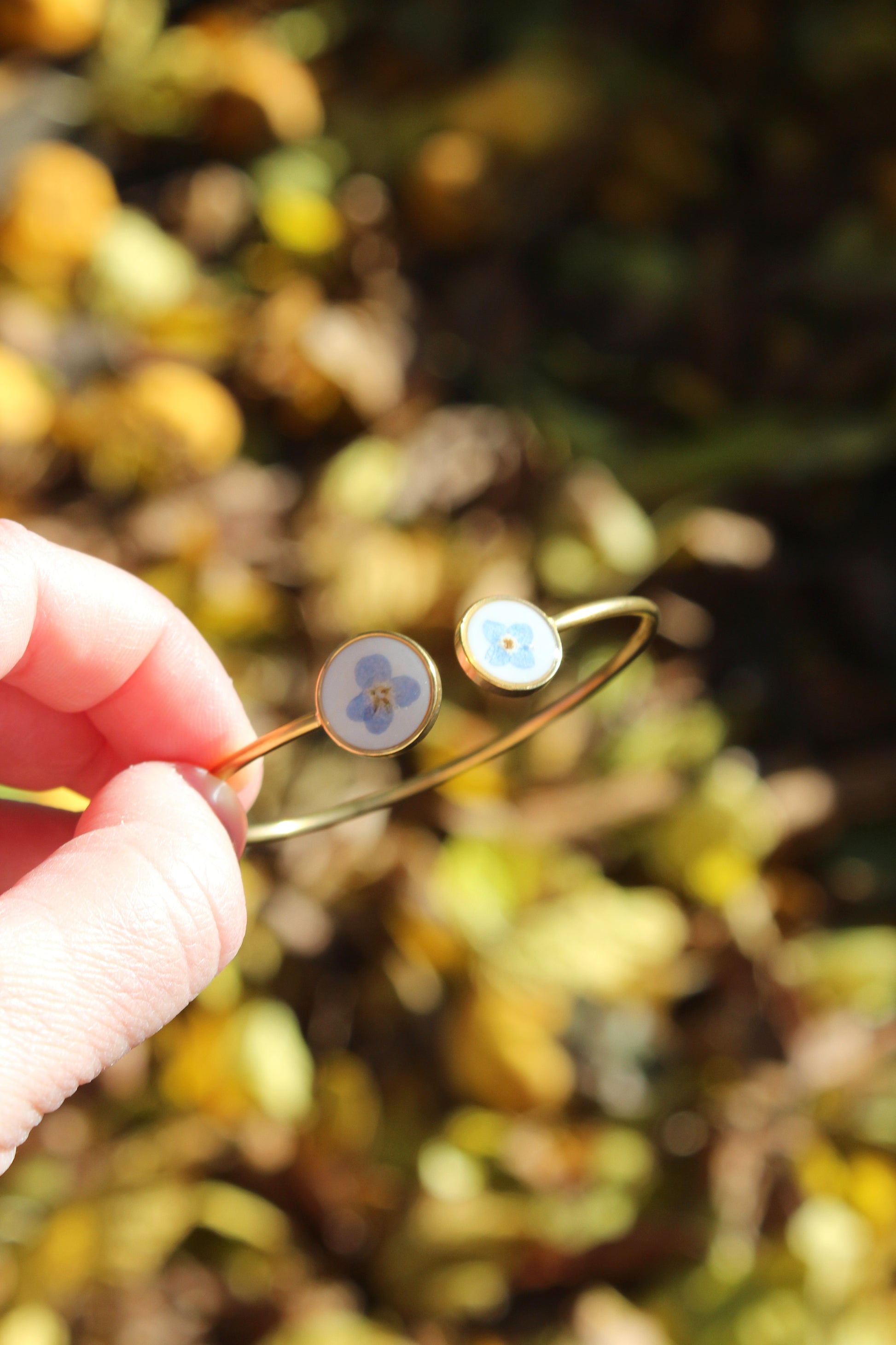Pulsera hecha a mano con flores nomeolvides.